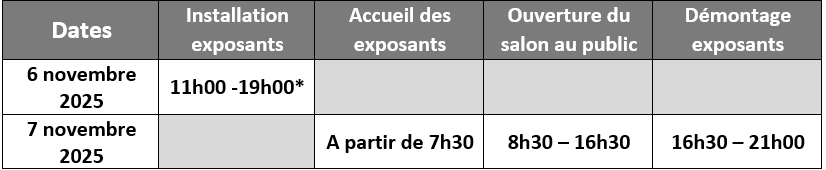 Passage de la commission de sécurité, le jeudi 6 novembre 2025. Les aménagements doivent être terminés. Présence obligatoire du responsable de votre stand si vous exposez des produits dangereux. Le chargé de sécurité du salon examinera la conformité de votre stand.